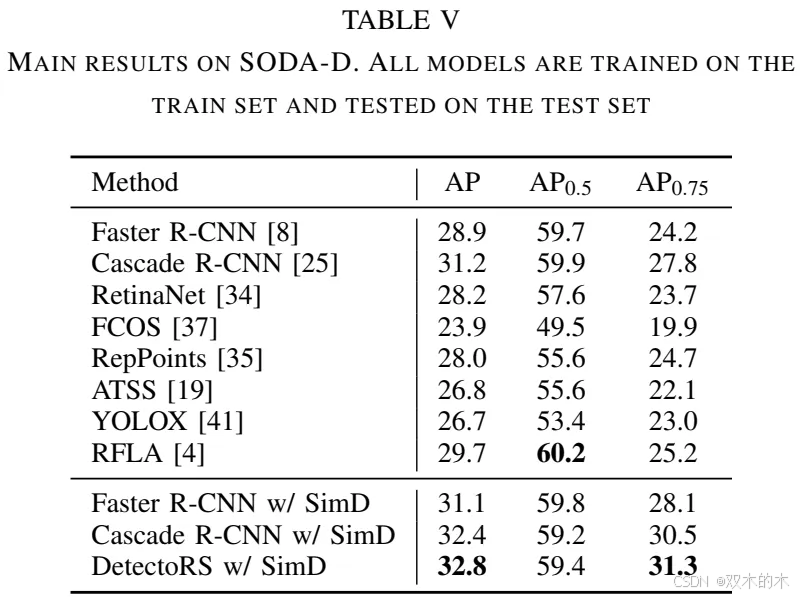 基于SimD的标签分配 在传统的目标检测器中,例如Faster R-CNN、Cascade R-CNN以及DetectoRS,区域提议网络(RPN)和R-CNN模型的标签分配策略通常采用MaxIoUAssigner。MaxIoUAssigner考虑了三个阈值:正样本阈值、负样本阈值和最小正样本阈值。对于那些与真实标签的IoU高于正样本阈值的锚点被视为正样本;IoU低于负样本阈值的锚点视为负样本;而IoU介于正样本阈值和负样本阈值之间的锚点则被忽略。针对小目标检测,Xu等人引入了RKA和HLA标签分配策略,这些策略不使用固定的阈值来划分正负样本。在RKA策略中,简单地选取与每个真实标签关联的前k个锚点作为正样本,这种策略能够增加正样本的数量,因为正样本的分配不受正样本阈值的限制。然而,引入过多低质量的正样本可能会导致检测精度下降。