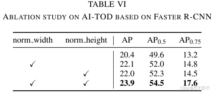 在我们提出的方法中,一个重要的操作是基于真实标签和锚点的宽度和高度进行归一化。为了验证归一化操作的有效性,我们进行了一系列消融研究。如表VI所示,我们分别比较了不进行归一化、仅归一化宽度、仅归一化高度以及同时归一化宽度和高度的情况。实验结果显示,归一化操作带来了3.5个点的性能提升,这主要是由于该操作使模型能够更好地适应数据集中不同尺寸的目标,并且归一化参数m、n可以根据不同的数据集进行自适应调整。