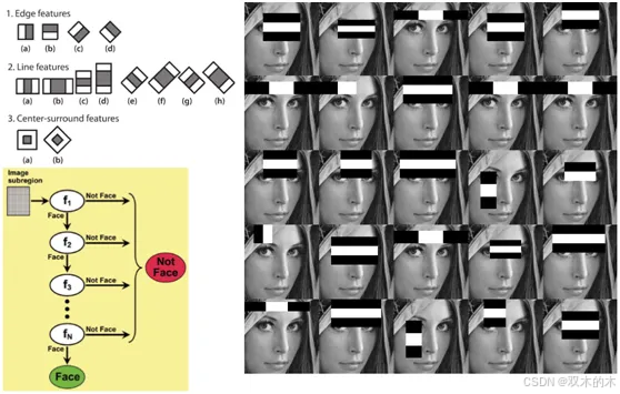 HARR特征级联分类器人脸检测来自VJ的2004论文中提出,其主要思想可以通过下面一张图像解释: