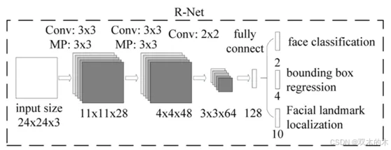 此外OpenCV还2016年提出的三阶段的人脸检测模型MTCNN的调用,也可以达到实时运行,MTCNN的网络结构如下: