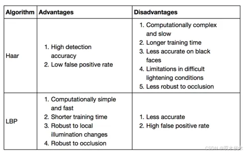 在OpenCV3.x这两种算法都支持人脸与眼睛识别,基本原理都是基于特征提取+级联分类器,它们之间有哪些异同点,下面的对比说明的很清楚: