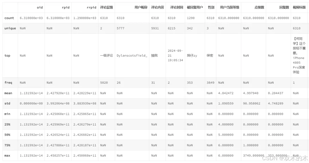<class 'pandas.core.frame.DataFrame'>RangeIndex: 6310 entries, 0 to 6309Data columns (total 14 columns):oid 6310 non-null int64rpid 6310 non-null int64rrpid 1290 non-null float64评论层级 6310 non-null object用户昵称 6310 non-null object评论内容 6310 non-null object评论时间 6310 non-null object被回复用户 1290 non-null object性别 6310 non-null object用户当前等级 6310 non-null int64点赞数 6310 non-null int64回复数 6310 non-null int64视频标题 6310 non-null object视频链接 6310 non-null objectdtypes: float64(1), int64(5), object(8)memory usage: 690.2+ KB