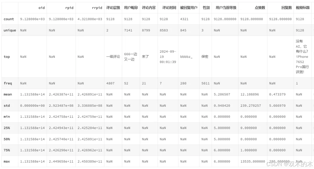 <class 'pandas.core.frame.DataFrame'>RangeIndex: 9128 entries, 0 to 9127Data columns (total 14 columns):oid 9128 non-null int64rpid 9128 non-null int64rrpid 4321 non-null float64评论层级 9128 non-null object用户昵称 9128 non-null object评论内容 9128 non-null object评论时间 9128 non-null object被回复用户 4321 non-null object性别 9128 non-null object用户当前等级 9128 non-null int64点赞数 9128 non-null int64回复数 9128 non-null int64视频标题 9128 non-null object视频链接 9128 non-null objectdtypes: float64(1), int64(5), object(8)memory usage: 998.5+ KB