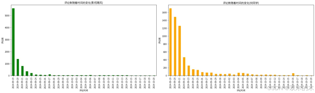 df1['评论时间'] = pd.to_datetime(df1['评论时间'])df2['评论时间'] = pd.to_datetime(df2['评论时间'])df1['评论时间'] = df1['评论时间'].dt.datedf2['评论时间'] = df2['评论时间'].dt.dateplt.figure(figsize=(20, 6))plt.subplot(1,2,1)df1.groupby('评论时间')['评论内容'].count().plot(kind='bar',color='green')plt.title('评论数随着时间的变化(影视飓风)')plt.xlabel('评论时间')plt.ylabel('评论数')plt.subplot(1,2,2)df2.groupby('评论时间')['评论内容'].count().plot(kind='bar',color='orange')plt.title('评论数随着时间的变化(何同学)')plt.xlabel('评论时间')plt.ylabel('评论数')plt.tight_layout()plt.show()