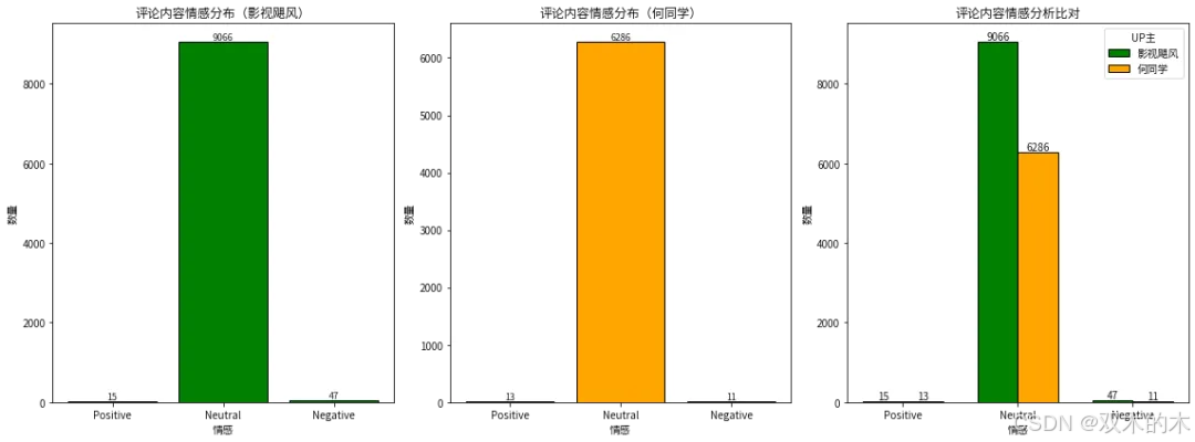 结论:从占比来看,影视飓风评论内容中的积极情感低于何同学的,消极情感高于何同学的。