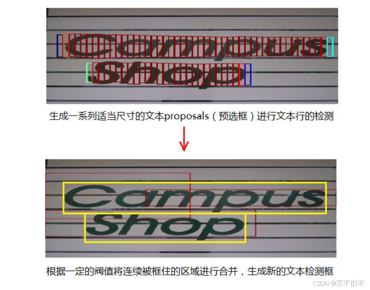 这也是CTPN的基本思路,既然宽度是可变、不确定的,那么就按照固定的高度进行检测,看看图像中有哪些区域是连续出现了一片同样高度特征的区域,并且其边缘符合文字的特点,就将其圈出来。