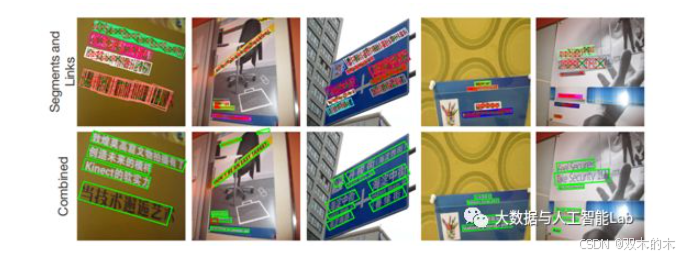 其中,segment(切片)、link(链接)是SegLink模型的创新之处,该模型不但学习了segment的位置信息,也学习了segment之间的link关系,以表示是否属于同一文本行(或者单词)。