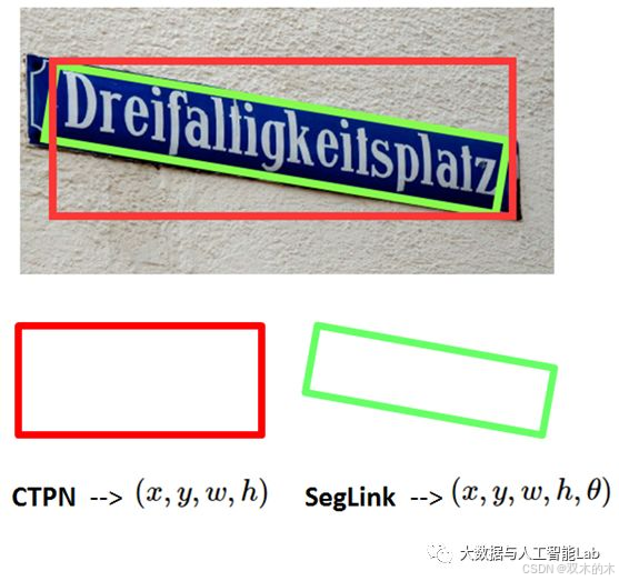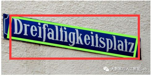 在自然场景中,例如灯箱广告牌、产品包装盒、商标等,要检测出其中的文字会面临着各种复杂的情况,例如角度倾斜、变形等情况,这时就需要使用基于深度学习的方法进行文字检测。在之前的文章中,介绍了基于卷积神经网络和循环神经网络的CTPN文本检测方法(见文章:大数据与人工智能Lab | 【附论文】白话文本检测经典模型:CTPN-优快云博客),该方法能在自然场景下较好地实现对文字的检测,但在CTPN中给出的文本检测效果是基于水平方向的,对于非水平的文本检测效果并不好,而在自然场景中,很多的文本信息都是带有一定的旋转角度的,例如用手机拍街道上的指示牌,如下图。如果文本检测的结果只有水平方向的,没有带角度信息,那么下图指示牌检测出来的就是红色框结果,而其实绿色框才是理想的检测目标,可见检测的结果误差太大。