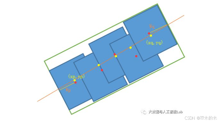 如下图所示,中间橙色直线表示最小二乘法回归后的直线,红点表示segment的中心点,黄点表示红点在直线上的垂直投影,绿色边框就是经过以上合并算法处理后的完整本文框。