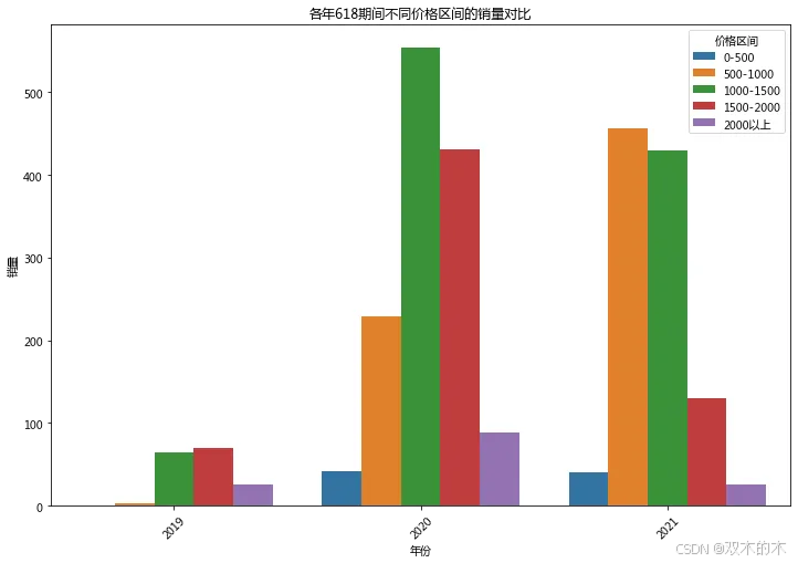 # 添加价格区间字段df_618['price_range'] = pd.cut(df_618['AMOUNTRETAIL'], bins=[0, 500, 1000, 1500, 2000, float('inf')], labels=['0-500', '500-1000', '1000-1500', '1500-2000', '2000以上'])# 按年份和价格区间统计销量和销售额price_analysis = df_618.groupby(['year', 'price_range']).agg({'QTY': 'sum', 'AMOUNTRETAIL': 'sum'}).reset_index()# print("各年618期间不同价格区间的销量和销售额数据:")# print(price_analysis)# 绘制价格区间对比图plt.figure(figsize=(12, 8))sns.barplot(x='year', y='QTY', hue='price_range', data=price_analysis)plt.title('各年618期间不同价格区间的销量对比')plt.xlabel('年份')plt.ylabel('销量')plt.xticks(rotation=45)plt.legend(title='价格区间')plt.show()
