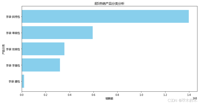 # 产品偏好分析product_sales = df.groupby(['ClassI', 'ClassII'])['订单金额'].sum().reset_index()top_products = product_sales.sort_values(by='订单金额', ascending=False).head(5)plt.figure(figsize=(12, 6))plt.barh(top_products['ClassI'] + ' ' + top_products['ClassII'], top_products['订单金额'], color='skyblue')plt.xlabel('销售额')plt.ylabel('产品分类')plt.title('前5热销产品分类分析')plt.gca().invert_yaxis()plt.show()