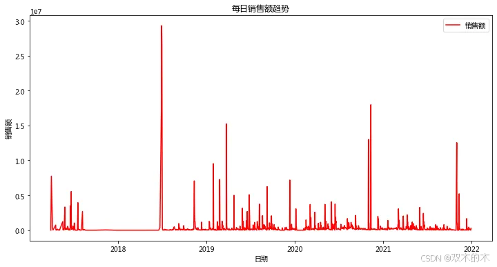 # 将BILLDATE转换为日期df['date'] = df['BILLDATE'].dt.date# 按日期统计销量和销售额sales_trend = df.groupby('date').agg({'QTY': 'sum','AMOUNTRETAIL': 'sum'}).reset_index()# 绘制销售趋势图plt.figure(figsize=(12, 6))plt.plot(sales_trend['date'], sales_trend['AMOUNTRETAIL'], label='销售额', color='red')plt.xlabel('日期')plt.ylabel('销售额')plt.title('每日销售额趋势')plt.legend()plt.show()