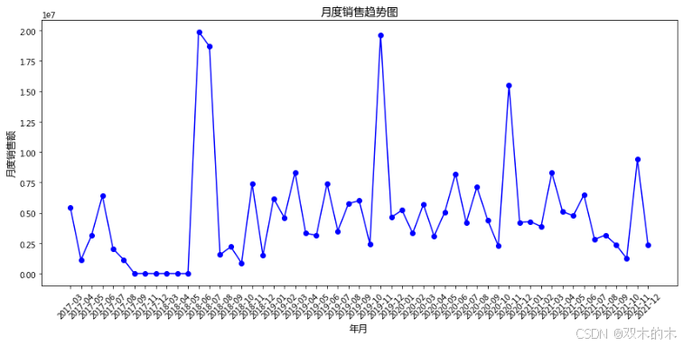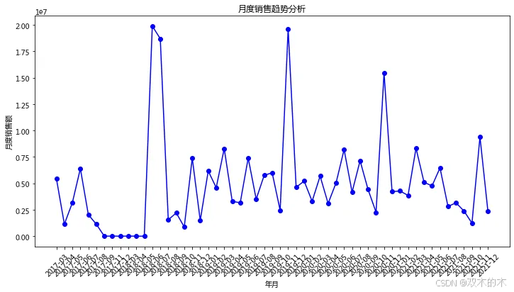 # 按月汇总销售数据df['YearMonth'] = df['BILLDATE'].dt.to_period('M')monthly_sales = df.groupby('YearMonth')['订单金额'].sum().reset_index()plt.figure(figsize=(12, 6))plt.plot(monthly_sales['YearMonth'].astype(str), monthly_sales['订单金额'], color='b', marker='o')plt.xlabel('年月')plt.ylabel('月度销售额')plt.title('月度销售趋势分析')plt.xticks(rotation=45)plt.show()