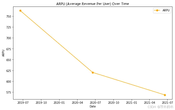 # 计算ARPUsummary['ARPU'] = summary['销售额'] / summary['DPU']# 绘制销售额和用户增长的关系plt.figure(figsize=(10, 6))plt.plot(summary['date'], summary['销售额'], label='Sales', marker='o', color='blue')plt.plot(summary['date'], summary['DPU'], label='DPU', marker='o', color='green')plt.xlabel('Date')plt.ylabel('Sales and DPU')plt.title('Sales and DPU Trends Over Time')plt.legend()plt.show()# 绘制ARPU 的变化趋势plt.figure(figsize=(10, 6))plt.plot(summary['date'], summary['ARPU'], label='ARPU', marker='o', color='orange')plt.xlabel('Date')plt.ylabel('ARPU')plt.title('ARPU (Average Revenue Per User) Over Time')plt.legend()plt.show()
