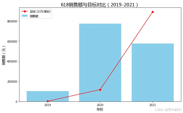 import matplotlib.pyplot as plt# 只保留2019年到2021年的数据sales_by_year['Target'] = sales_by_year['Sales'].shift(1) * 1.15sales_by_year['Target'].fillna(0, inplace=True) # 填充第一个目标为空的值sales_by_year['Gap'] = sales_by_year['Sales'] - sales_by_year['Target']sales_by_year['Achieved'] = sales_by_year['Sales'] >= sales_by_year['Target']sales_by_year_filtered = sales_by_year[sales_by_year['Year'] >= 2019]# 绘制销售额和目标对比图plt.figure(figsize=(10, 6))plt.bar(sales_by_year_filtered['Year'], sales_by_year_filtered['Sales'], color='skyblue', label='销售额')plt.plot(sales_by_year_filtered['Year'], sales_by_year_filtered['Target'], color='red', marker='o', linestyle='-', label='目标 (15% 增长)')# 图表设置plt.title('618销售额与目标对比(2019-2021)', fontsize=16)plt.xlabel('年份', fontsize=12)plt.ylabel('销售额(元)', fontsize=12)plt.legend()plt.xticks(sales_by_year_filtered['Year'])plt.show()