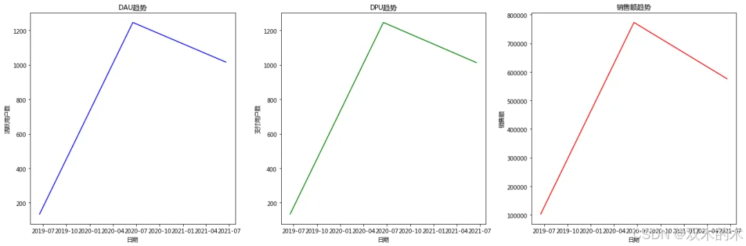 # 可视化DAU、DPU和销售额的趋势plt.figure(figsize=(18, 6)) # 宽18,高6# DAU趋势plt.subplot(1, 3, 1)plt.plot(summary['date'], summary['DAU'], label='DAU', color='blue')plt.title('DAU趋势')plt.xlabel('日期')plt.ylabel('活跃用户数')# DPU趋势plt.subplot(1, 3, 2)plt.plot(summary['date'], summary['DPU'], label='DPU', color='green')plt.title('DPU趋势')plt.xlabel('日期')plt.ylabel('支付用户数')# 销售额趋势plt.subplot(1, 3, 3)plt.plot(summary['date'], summary['销售额'], label='销售额', color='red')plt.title('销售额趋势')plt.xlabel('日期')plt.ylabel('销售额')plt.tight_layout()plt.show()
