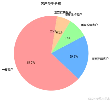 import matplotlib.pyplot as plt# 统计不同客户类型的数量customer_type_counts = rfm['客户分类'].value_counts()# 绘制饼图plt.figure(figsize=(8, 6))customer_type_counts.plot(kind='pie', autopct='%1.1f%%', startangle=90, colors=['#ff9999','#66b3ff','#99ff99','#ffcc99'])plt.title('客户类型分布')plt.ylabel('')plt.show()