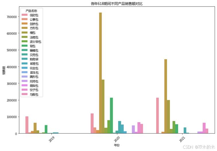 # 按产品名称和年份统计每年618期间的销量和销售额product_analysis = df_618.groupby(['year', 'ProductName']).agg({'QTY': 'sum', 'AMOUNTRETAIL': 'sum'}).reset_index()# print("各年618期间不同产品销量和销售额数据:")# print(product_analysis)import seaborn as snsplt.figure(figsize=(12, 8))sns.barplot(x='year', y='QTY', hue='ProductName', data=product_analysis)plt.title('各年618期间不同产品销量对比')plt.xlabel('年份')plt.ylabel('销量')plt.xticks(rotation=45)plt.legend(title='产品名称')plt.show()# 销售额对比plt.figure(figsize=(12, 8))sns.barplot(x='year', y='AMOUNTRETAIL', hue='ProductName', data=product_analysis)plt.title('各年618期间不同产品销售额对比')plt.xlabel('年份')plt.ylabel('销售额')plt.xticks(rotation=45)plt.legend(title='产品名称')plt.show()