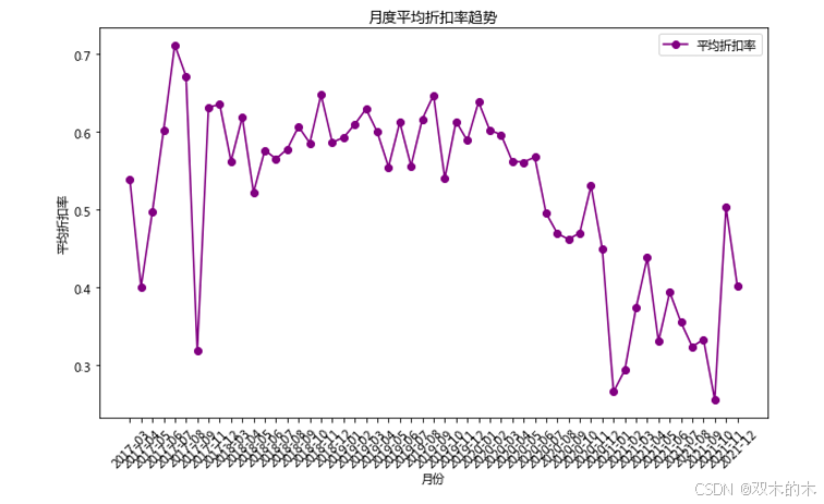 # 促销力度分析df['Discount'] = (df['AMOUNTRETAIL'] - df['订单金额']) / df['AMOUNTRETAIL']avg_discount = df.groupby('YearMonth')['Discount'].mean()plt.figure(figsize=(10, 6))plt.plot(avg_discount.index.astype(str), avg_discount.values, marker='o', color='purple', label='平均折扣率')plt.title('月度平均折扣率趋势')plt.xlabel('月份')plt.ylabel('平均折扣率')plt.xticks(rotation=45) # 横坐标倾斜45度,便于阅读plt.legend()plt.show()