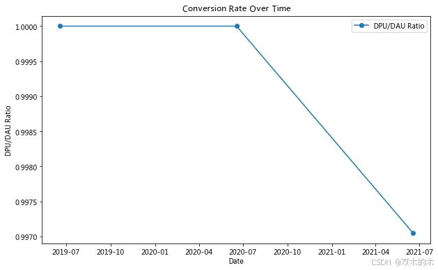 # 计算 DPU/DAU 比率summary['DPU_DAU_ratio'] = summary['DPU'] / summary['DAU']# 绘制 DAU 和 DPU 趋势图plt.figure(figsize=(10, 6))plt.plot(summary['date'], summary['DAU'], label='DAU', marker='o')plt.plot(summary['date'], summary['DPU'], label='DPU', marker='o')plt.xlabel('Date')plt.ylabel('Users')plt.title('DAU and DPU Trends Over Time')plt.legend()plt.show()# 绘制付费转化率趋势图plt.figure(figsize=(10, 6))plt.plot(summary['date'], summary['DPU_DAU_ratio'], label='DPU/DAU Ratio', marker='o')plt.xlabel('Date')plt.ylabel('DPU/DAU Ratio')plt.title('Conversion Rate Over Time')plt.legend()plt.show()