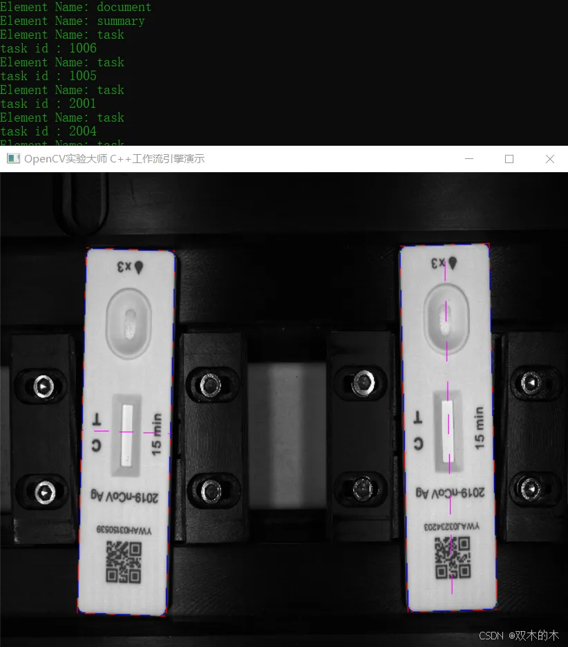#include "main_workflow.h"#include <iostream>#include <fstream>int main(int argc, char** argv) {std::shared_ptr<QTongCoreCVWorkFlow> engine(new QTongCoreCVWorkFlow());bool succ = engine->initWorkFlow("D:/12121.vm", "69585e470300cdb5a6910131eb639882");if (!succ) {std::cout << "Could not load workflow file here..." << std::endl;return -1;}cv::Mat frame = cv::imread("D:/facedb/CT_Testing/nCovAg6.bmp");cv::namedWindow("OpenCV实验大师 C++工作流引擎演示", cv::WINDOW_NORMAL);cv::Mat result;std::vector<std::string> logs;engine->run_workflow(frame, result, logs);cv::imshow("OpenCV实验大师 C++工作流引擎演示", result);cv::waitKey(0);cv::destroyAllWindows();return 0;}