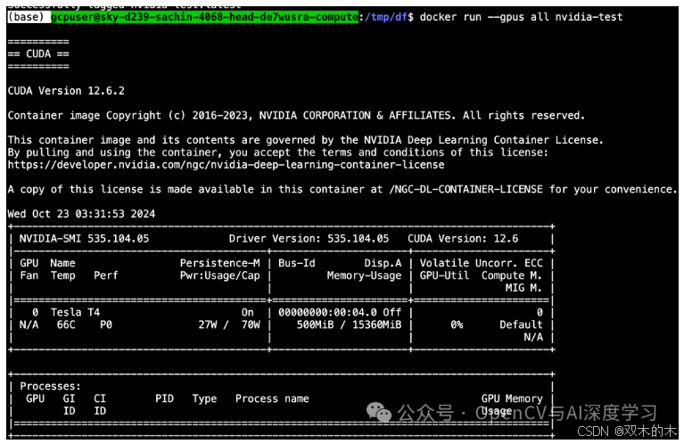 请记住,我们需要 --gpus all 标志,否则 GPU 将不会暴露给正在运行的容器。