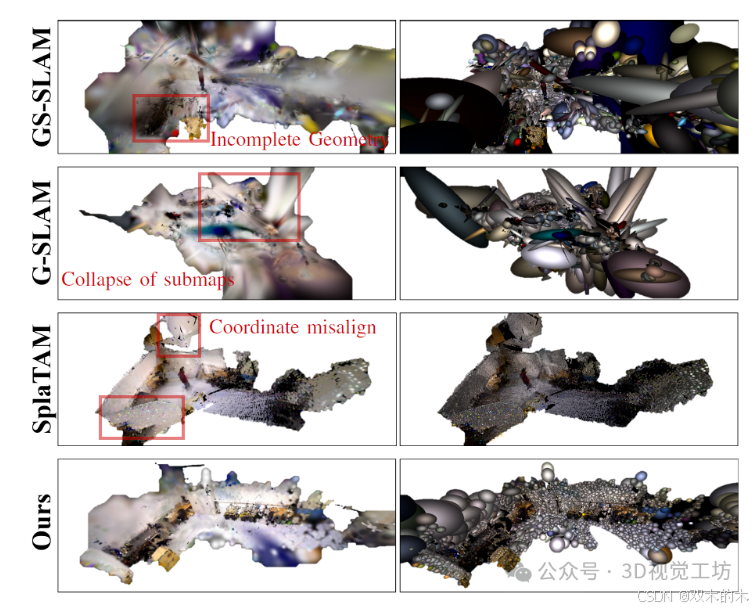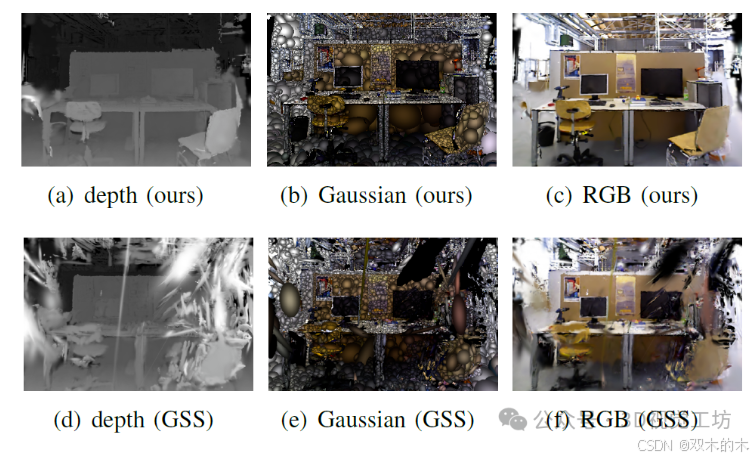 在fr3/walk_st场景中的TUM RGB-D数据集上,举例说明Gassidy与GS-SLAM(此处为GSS) [15]相比的性能。一行中的三个图像表示渲染深度、创建的高斯和渲染的RGB。