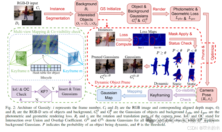 Gassidy的架构如图2所示,我们的目标是跟踪相机姿态(Ri, ti)并使用输入图像Ci及其深度信息Di生成用于场景重建的清晰高斯图。跟踪过程首先从通过YOLO分割[18]生成的实例掩码Si中区分出物体Oi和背景Bi开始。集合Oi可能包含N个物体,每个物体都被分配一个对象ID j,第j个物体表示为Oi(j),其中j ∈ [0,N]。具体而言,Oi包括静态和动态物体,其中动态物体容易被误识别并需要被过滤掉。为最大限度地减少对先验环境知识的依赖,我们初始化高斯分布GOi和GBi来分别表示物体和背景,而无需其动态特征的详细语义。随后,我们渲染这些高斯分布,并使用光度-几何损失函数计算渲染损失流。此过程支持我们过滤掉动态物体并优化相机姿态。详细过程在“动态对象修剪”部分中概述,该部分由红色虚线框标记。