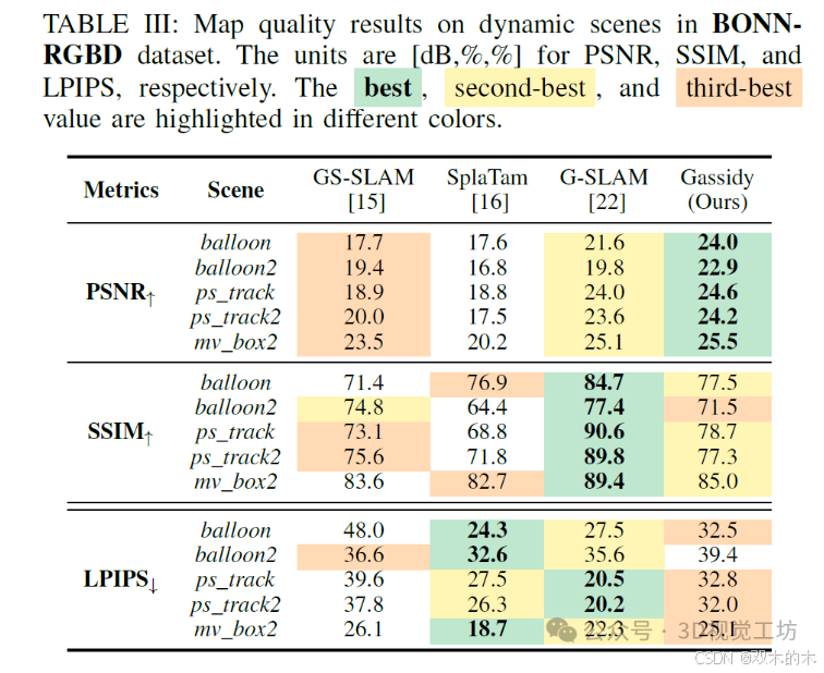 • 与最先进的密集SLAM方法相比,Gassidy在使用广泛公开的数据集(“TUM RGBD”和“BONN Dynamic RGB-D”)时,实现了更高的相机姿态跟踪精度和更精细的映射质量场景重建。特别是,在应用Gassidy时,跟踪精度和映射质量可分别提高多达97.9%和6%。