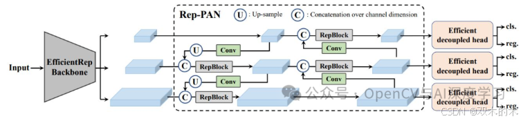 Neck:使用 Rep-PAN 拓扑,使用 RepBlock 或 CSPStackRep 块增强 YOLOv4 和 YOLOv5 中修改后的 PAN 拓扑。这提供了来自主干网不同级别的更高效的特征聚合。