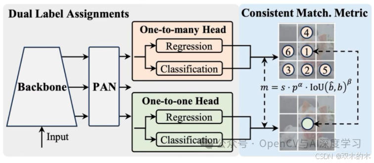 无 NMS 检测:YOLOv10 提供了一种基于一致双重分配的新颖无 NMS 训练策略。它采用双标签分配(一对多和一对一)和一致的匹配指标,在训练期间提供丰富的监督,同时在推理过程中消除 NMS。在推理过程中,仅使用 1 对 1 头,从而实现无 NMS 检测。