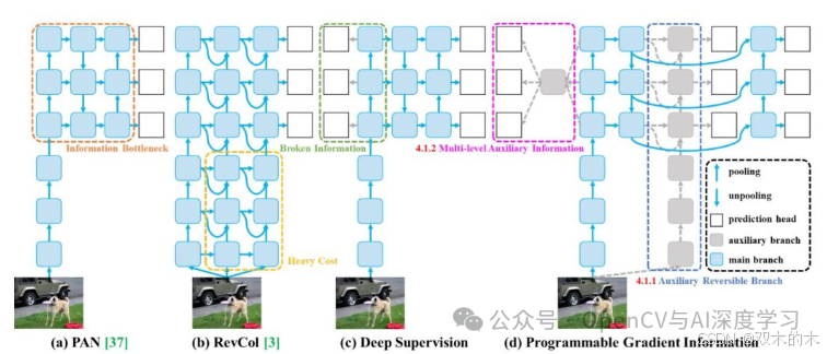 YOLOv9 引入了 PGI,这是一种通过使用辅助可逆分支生成可靠梯度的新方法。此辅助分支为计算目标函数提供了完整的输入信息,从而确保用于更新网络权重的梯度信息量更大。辅助分支的可逆性质确保在前馈过程中不会丢失任何信息。