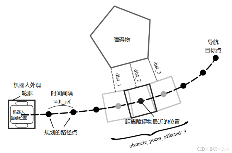 如图5所示,在TEB的算法框架中,机器人位于当前位置,目标点是全局路径上的一个点,这两个点类似橡皮筋的两端,是固定的。接下来,TEB算法会在两点之间插入一些机器人的姿态点控制橡皮筋的形变,为了显示轨迹的运动学信息,还得定义点和点之间的运动时间,也就是这里Time的含义。