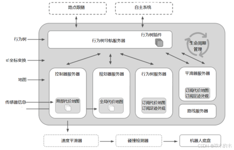 这三个服务器通过行为树进行组织和管理。行为树决定了各个功能模块的执行顺序和条件,确保导航过程的正确性和有效性。