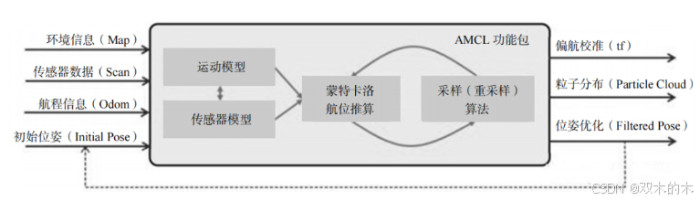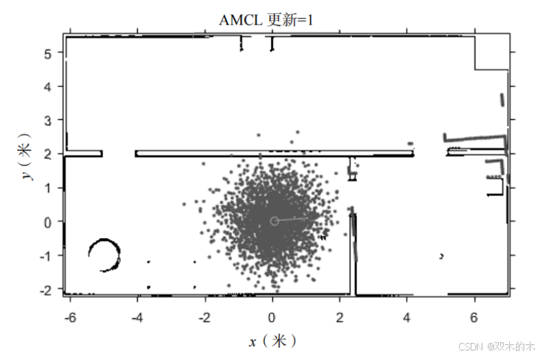 AMCL功能包封装了一套针对二维环境的蒙特卡罗定位方法,如图6所示,算法的核心是粒子滤波器,它使用一系列粒子来表示机器人可能的状态。