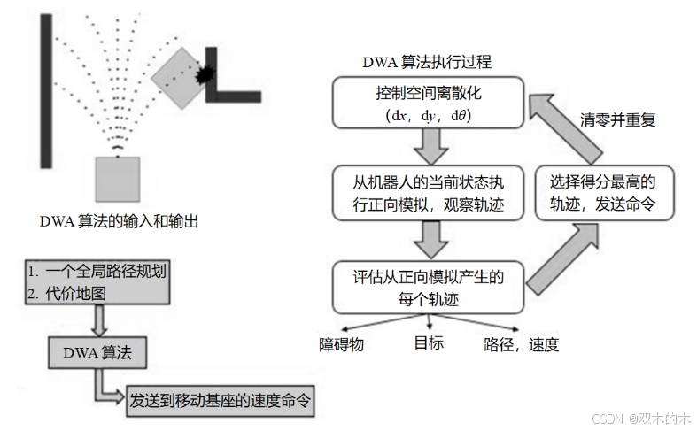DWA算法。DWA(Dynamic Window Approaches)算法的输入是全局路径和本地代价地图的参考信息,输出是整个导航框架的最终目的——传输给机器人底盘的速度指令。这中间的处理过程是什么样的呢?如图4右侧所示。
