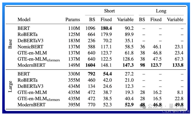 ModernBERT速度是DeBERTa的两倍;在更常见的输入长度混合的情况下,速度可达4倍;长上下文推理比其它模型快约3倍。