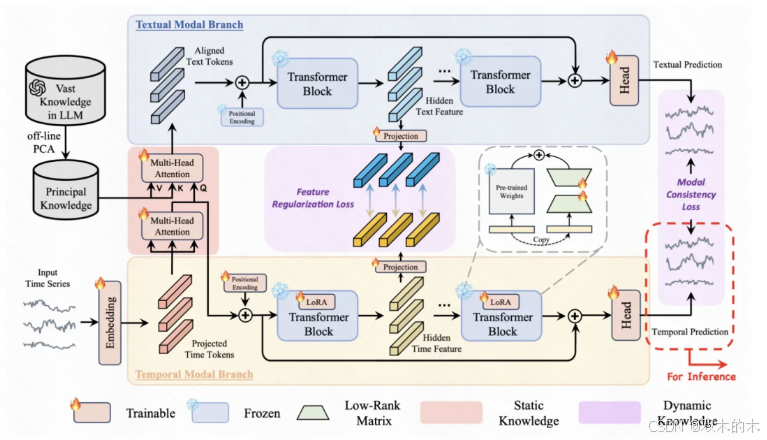Taming Pre-trained LLMs for Generalised Time Series Forecasting via Cross-modal Knowledge Distillation提出一种文本+时序模型双分支的结构,都从LLM进行参数初始化,并进行跨模态的表征对齐。整体模型包含两个分支,一个分支是文本模型,使用预训练的GPT2;另一个分支是时间序列模型,用来对时间序列数据进行编码,也使用预训练的GPT2。对于输入的多元时间序列数据,首先使用iTransformer中的方法,将每个变量的序列看成一个token,生成多元时间序列的表征。对于文本模型侧,首先使用PCA对word embedding做一个降维,生成cluster。为了实现时间序列和文本信息的对齐,使用一个multi-head attention,以时间序列表征作为Query,文本模型的cluster表征作为Key和Value计算融合表征。