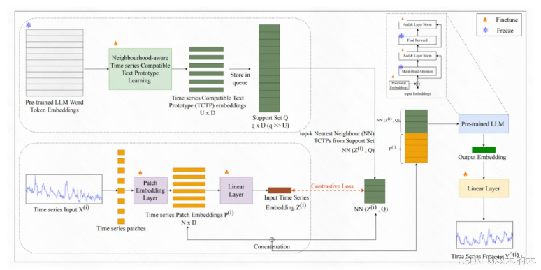 Rethinking Time Series Forecasting with LLMs via Nearest Neighbor Contrastive Learning提出一种方法是训练几个文本原型向量,并让其对齐时间序列数据表征,最后将这些原型向量作为prompt加入到时间序列输入中。文中提出的文本原型向量名为TCTP。如下图所示,其核心是在LLM的token embedding表征空间中,学一些可学习的embedding,实现一种对原始token embedding聚类的目的。同时,通过对比学习的手段,拉近这些原型embedding和时间序列表征之间的距离,作为一个中间桥梁对齐token embedding和时间序列embedding。