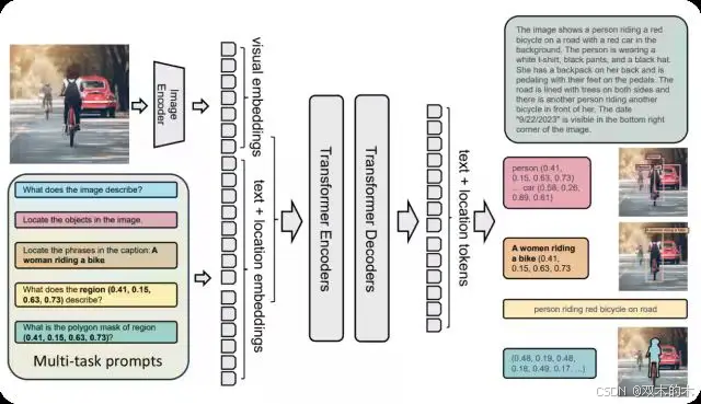 模型的编码器负责将图像转换为序列表示,而解码器则将这些表示转换为输出文本。该模型以循序渐进的方式处理输入序列(如带有文本提示的图像)并生成输出序列(如描述或标签)。另外Florence-2的最大亮点是统一表示,可将不同类型的视觉信息和语言信息包括图像描述、目标检测、视觉定位和分割等,整合到一个统一的框架中,帮助模型在不同的任务之间共享知识,提高学习效率。