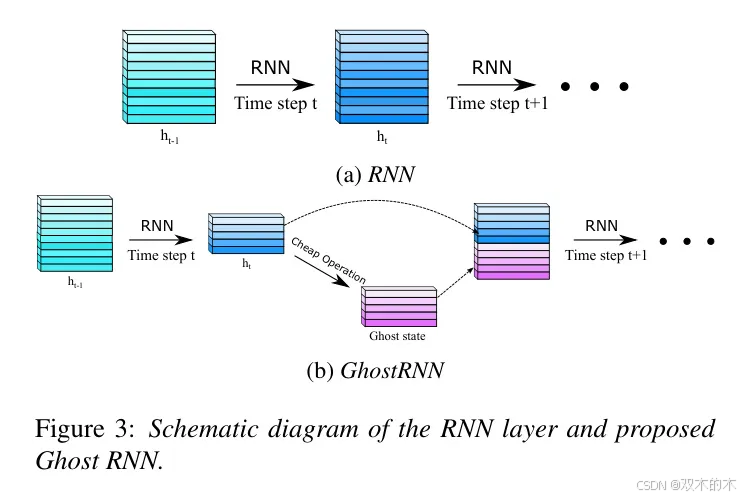 基于上述结果和分析,作者提出GhostRNN模块,该模块基于内在状态构建鬼状态,如图3所示,可以定义如下: