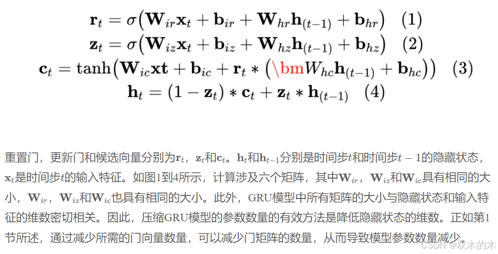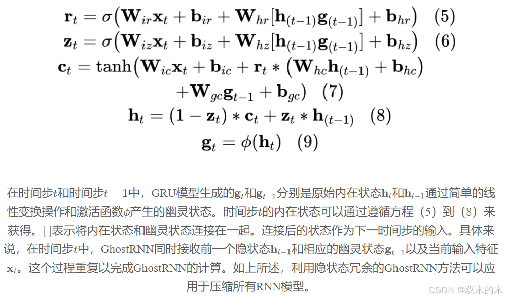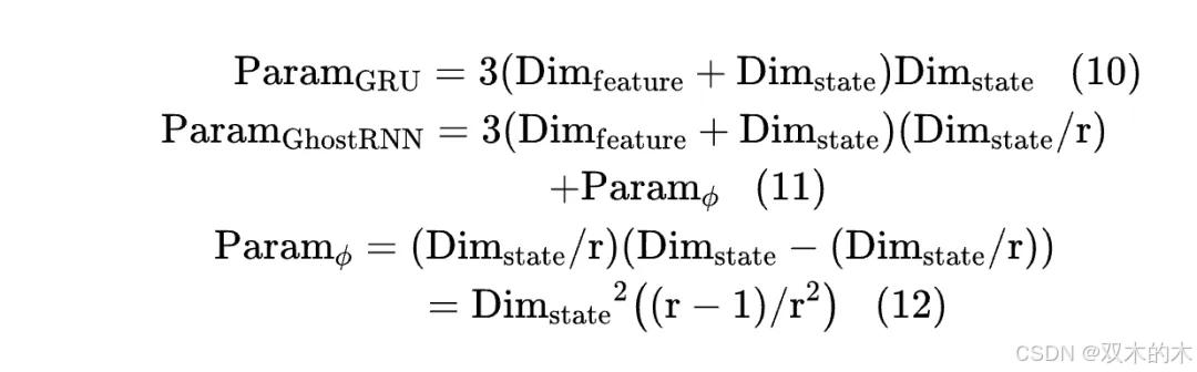 其中, r表示完整状态与内在状态的比例。如 Eqs (10) 至 (11) 所示,GhostRNN 的输出隐状态维度被比例 r与常规 GRU 中的相比。尽管应用了一个额外的廉价操作模块,由线性层组成,根据 Eq. (12),廉价操作模块的参数数量远小于 GRU 模型。因此,GhostRNN 的总参数数量将压缩为 r倍。