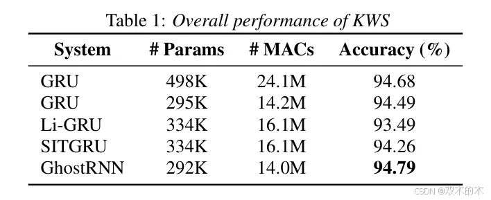 表1中展示了,作为KWS[3]的基准模型,使用了大小约为500k的GRU模型,以及大小约为295k的另一个GRU模型,同时实现了Li-GRU[12]和SITGRU[14]进行比较。