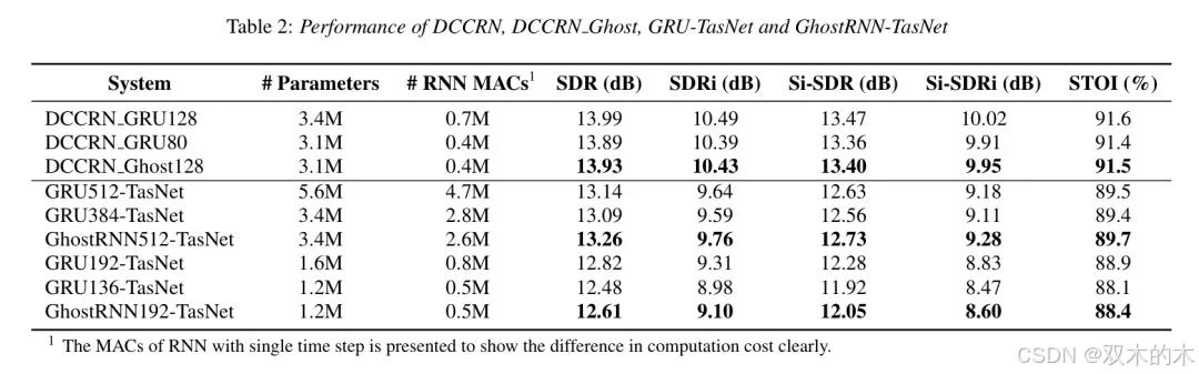 此外,作者的方法在SDR和其他评估指标方面,与具有相同参数数量的基础GRU模型相比,大约提高了0.13 dB。总体而言,提出的GhostRNN是一种简单而有效的RNN模型压缩方法。在未来的工作中,值得研究将GhostRNN扩展到其他RNN结构,如LSTM,并进一步探索新的鬼状态生成方法,以实现模型计算复杂性和性能之间的更好平衡。此外,作者计划探索将GhostRNN与其他现有RNN压缩技术结合的潜在好处。