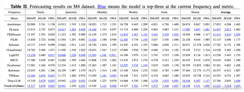 在 OWA 指标上,TimeRAG 以 1.03 的得分领先,其次是 FEDformer 和 Time-LLM。