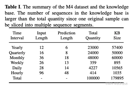 实验在 M4 基准数据集 上进行评估。M4 数据集广泛用于时间序列预测,包含来自金融、人口统计、市场营销等多个领域的数据,具有不同的时间采样频率(如年、季度、月、周、日、小时)。每个频率对应特定的预测范围和输入长度,支持对预测模型的全面评估。