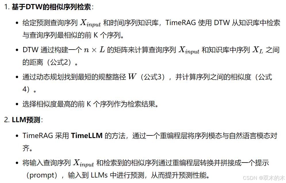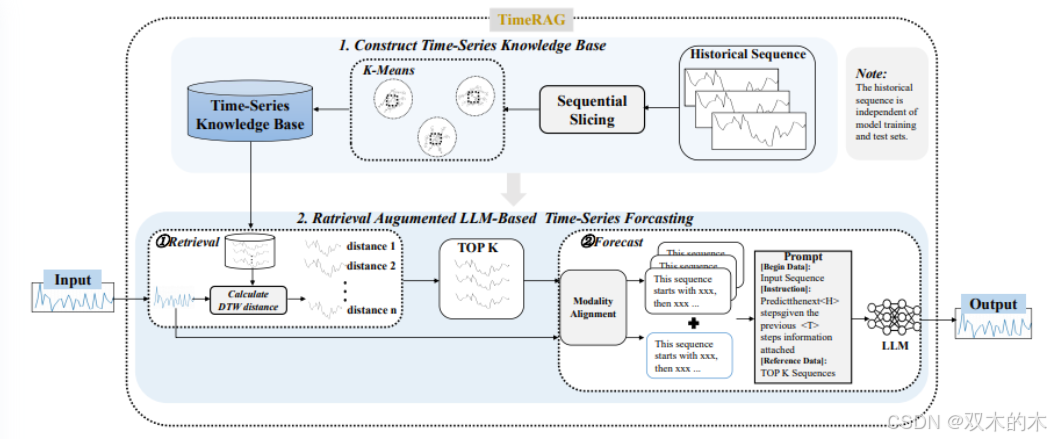 TimeRAG框架从历史序列中构建时间序列知识库,使用动态时间规整(Dynamic Time Warping, DTW)作为距离度量,从知识库中检索与查询序列具有相似模式的参考序列,并将这些参考序列与预测查询结合为文本提示,输入到时间序列预测的LLM中。