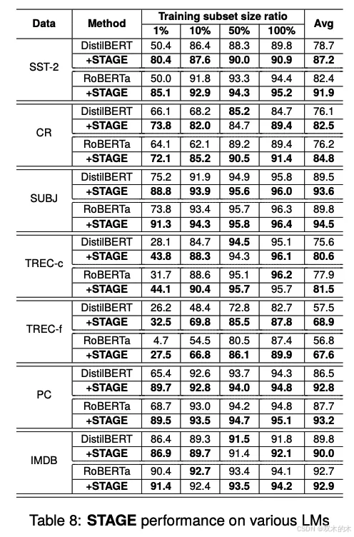 STAGE在多分类任务(如TREC-c和TREC-f)中的性能提升尤为显著,相比二分类任务(如SST-2、CR、SUBJ、PC、IMDB),STAGE在多分类任务中的性能提升幅度更大(11.9%到35.0%)。这表明STAGE在处理复杂分类任务时具有显著优势。