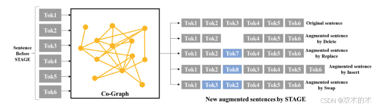 STAGE方法的核心在于利用共现图(co-graph)来选择文本修改操作的操作数。共现图从文本数据中构建,能够建模词与词之间的关系,从而为操作数的选择提供重要信息。