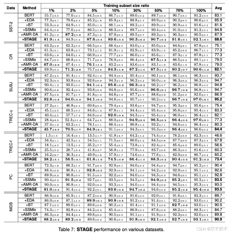 表7展示了STAGE与其他数据增强方法的性能对比。对比方法包括: